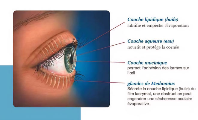 Dans la plupart des cas, c'est la couche lipidique (grasse) du film lacrymal qui est de qualité ou de quantité insuffisante.